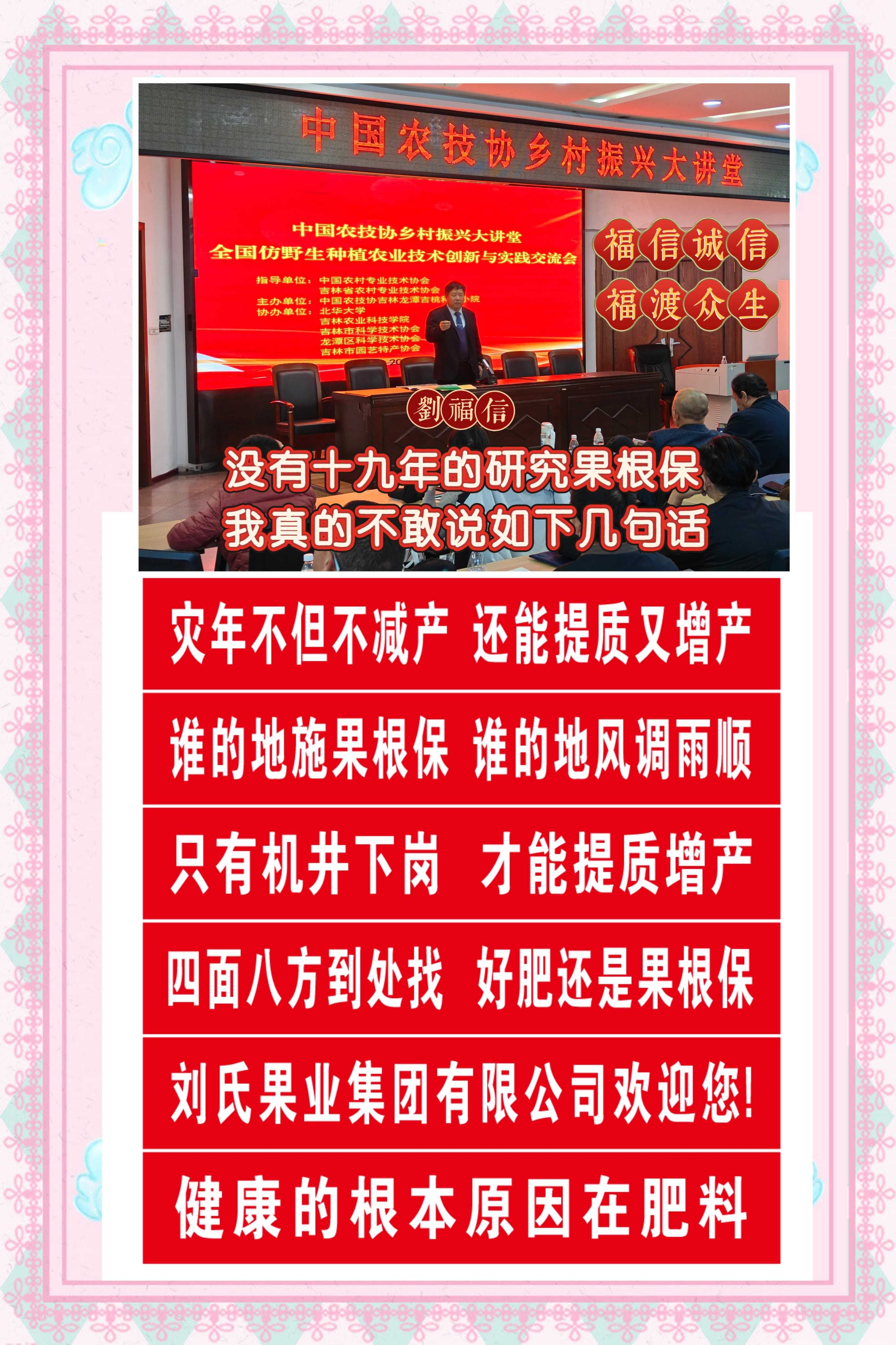 果根保被中国农科院果树研究所汪景彦教授称为”果根保有六大*、八大功能“。”固体果根保“能补充30多种果树急需的中微量及有益元素,并能*植物抗病能力。解决了传统肥料伤害土壤的弊端,从根本上发挥了净化土壤,激发老根活力,*植物根系下扎,使其根系发达,并能促使土壤内的微生物活力*,活化养分,为农作物提供多种微量元素;还起到了使农作物叶色更浓绿,更有光泽,茎秆粗壮,抗病能力增强,黄叶复绿,叶、果个明显的效果,使作物生长壮而控旺的效果,是未来农业用肥的发展方向。刘氏果业集团公司产品施用范围广泛,包括经济作物、果树、蔬菜、药材、茶叶、花卉、大田作物等。主要产品:肥料系列有复合肥、矿物肥、有机肥、微生物菌剂。果根保系列产品:益植健、施保发、果树专用、蔬菜专用、花生专用、茶叶专用、树莓专用、花卉专用、大田专用、甘蔗专用、玉米专用、小麦专用、水稻专用。刘氏果业集团公司自开创以来始终心系三农,关注民生,以高起点,高素质,高要求,过硬的产品质量,周密的市场服务,严格的市场保护,互诚互信,赢得了广大经销客户和百姓的信赖。产品畅销河南、河北、山东、陕西、山西、江苏、安徽、辽宁、新疆、海南、四川、云南、广东、广西、福建、湖南、湖北、吉林、内蒙等280多个地区和东南亚5个国家。
